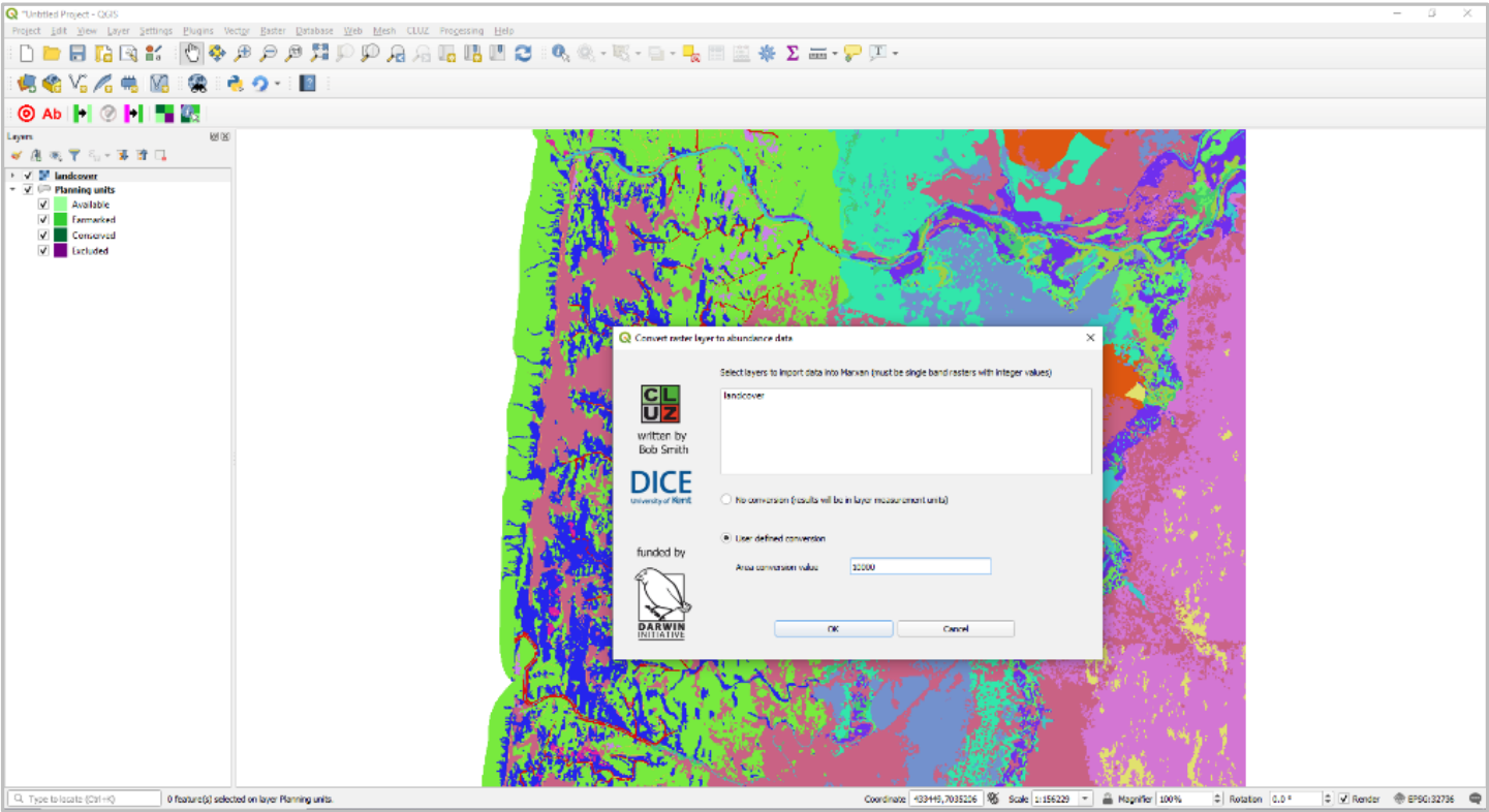 CLUZ is a plugin for QGIS that lets people design conservation landscapes and seascapes based on the principles of systematic conservation planning. It can be used for on-screen terrestrial and marine spatial planning and also acts as a link for the Marxan and Marxan with Zones spatial prioritisation software packages. CLUZ was funded by the UK Government’s Darwin Initiative.